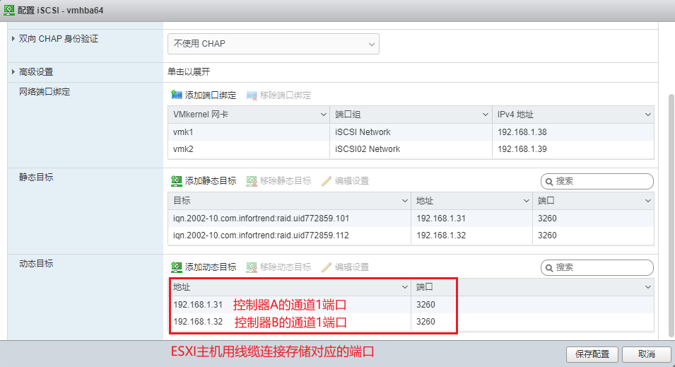 最后,还需要在ESXI主机中再配置一下iSCSI,多添加一条”动态目标“。因为普安infortrend GS1012R2是双控制器的,每个控制器都有各自的通道,比如上面的控制器接线图,ESXI服务器分别接了控制器A的通道1端口(设置的ip是192.168.1.31) 和 控制器B的通道1端口(设置的ip是192.168.1.32),这样可以双路径通讯,如果其中一个控制器或者链路出现故障,会自动切换到另外一个控制器和链路。添加完成后,如下图: