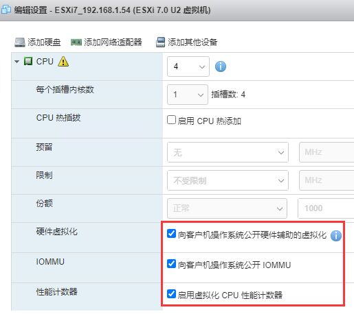 要迁移磁盘大于 2TB 的虚拟机,源和目标 ESXi 主机必须为版本 6.0 或更高版本。ESXI的嵌套,CPU要开启硬件虚拟化。物理主机需要把网络端口组设置安全策略为混杂模式,否则嵌套的虚拟机的网络会不通。
