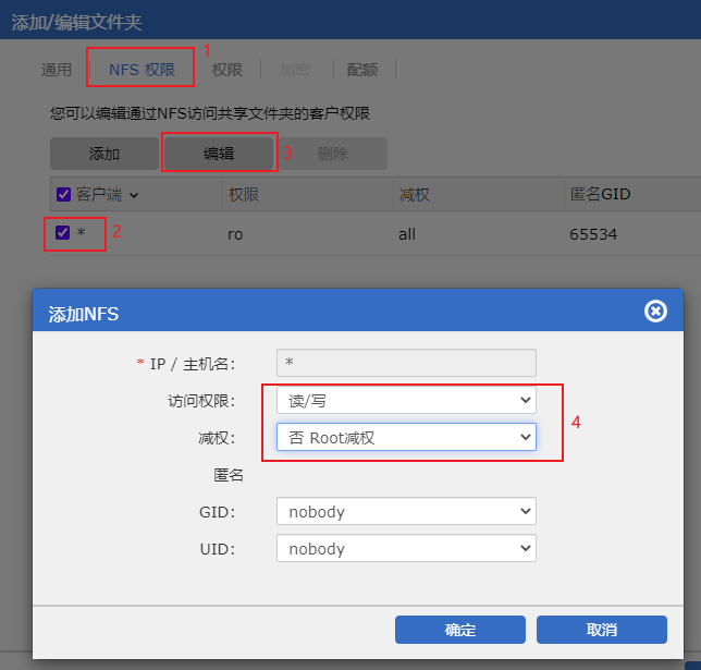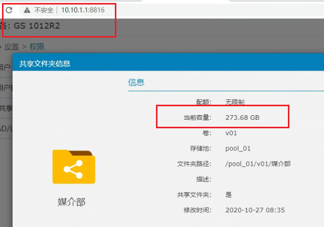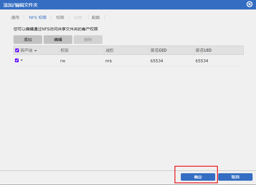 1、登录管理页面首页,“设置”—“权限”—“共享文件夹”—“添加”,新建一个共享文件夹,按下图勾选协议。